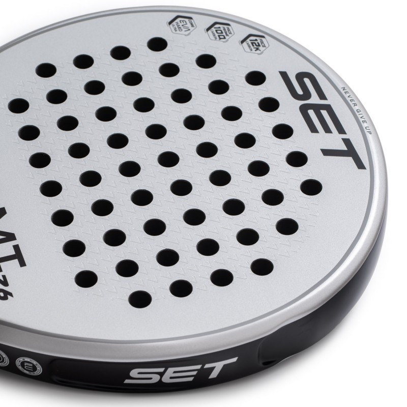 Carbono 3k en las caras que dan una dureza y salida de bola impresionante. Pala acabada en brillo rugoso especial para los efectos.